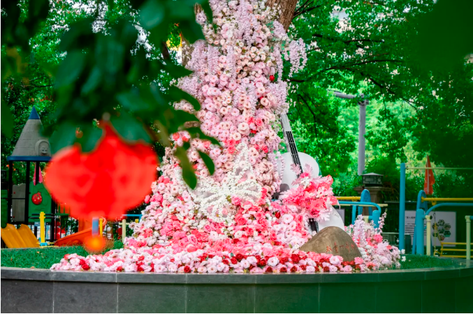 不僅高聳入云的“雙童一號樹(shù)”被裝點(diǎn)得如詩(shī)如畫(huà),就連它腳下的每一寸土地也未能幸免于這場(chǎng)裝飾盛宴。是的你沒(méi)看錯,一號樹(shù)下四位工作人員親自動(dòng)手、群策群力、加班加點(diǎn),將一朵朵花插入一號樹(shù)下打造出了一面唯美的花墻!