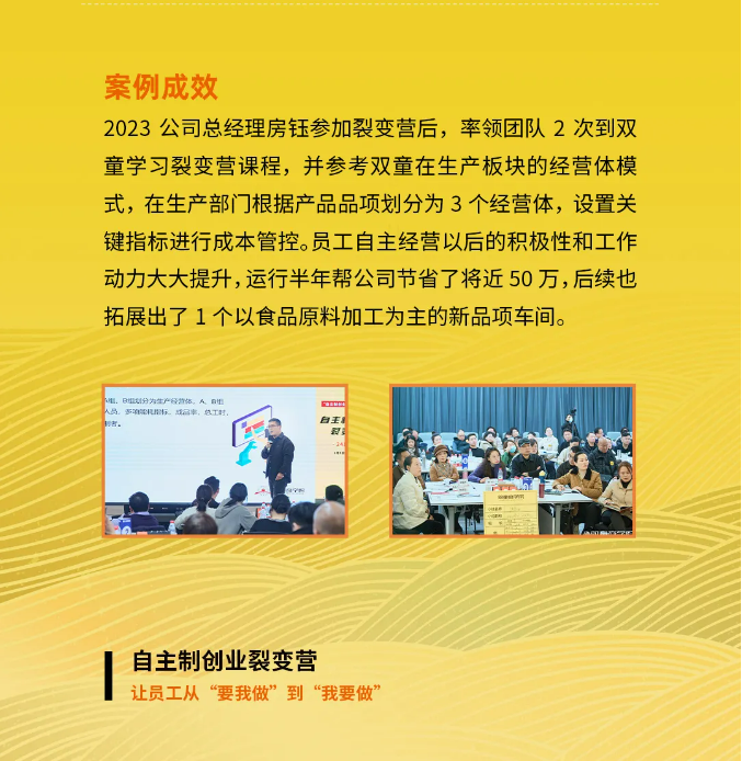 而《自主制創(chuàng )業(yè)裂變營(yíng)》就是依托該機制,把“雙童”的落地實(shí)操方法與成功經(jīng)驗經(jīng)驗有機結合,不斷打磨、升級的一套針對中小微企業(yè)的管理課程。
