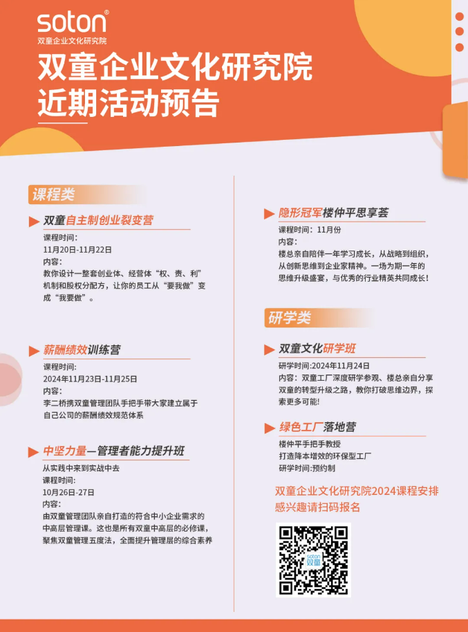 經(jīng)久耐用的食堂餐桌是“雙童”長(cháng)期主義的代表走過(guò)百米文化長(cháng)廊, 廣州市委統戰部領(lǐng)導一行通過(guò)文字和圖片見(jiàn)證了“雙童”不同階段的成長(cháng)。在講到雙童“家文化”的時(shí)候,“雙童”的組織關(guān)系如何規避血緣關(guān)系、保持企業(yè)內部的清廉成了領(lǐng)導們好奇的地方。創(chuàng )始人樓仲平告訴大家,正是由于“家文化”的特殊性,“雙童”的組織關(guān)系特別注意強化規則關(guān)系、契約關(guān)系、團隊關(guān)系和社會(huì )關(guān)系!同時(shí)在2011年明確提出組織關(guān)系的三原則:子女不接班、有血緣關(guān)系的直系親屬不得進(jìn)入管理層、可以是家族企業(yè)但不能成為家里的企業(yè)。