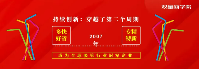 通過(guò)打破“吸管只能用來(lái)喝水”的隱含假設,運用創(chuàng )新思維,讓吸管從單一的“喝水”功能向情感化、體驗化和娛樂(lè )化延伸,滿(mǎn)足了中小客戶(hù)群體的定制化需求,開(kāi)辟了一個(gè)獨屬于雙童的商業(yè)“藍?!?/span>!并通過(guò)持續的創(chuàng )新,讓雙童又穿越了一個(gè)周期,完成了從“多快好省”到“專(zhuān)精特新”的轉變,成為吸管行業(yè)當之無(wú)愧的“隱形冠軍”!