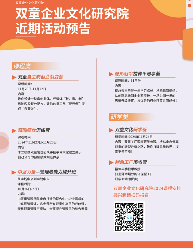 雙童的成長(cháng)歷程中,我們能清晰地感知到,樓總一直在尋求破界、創(chuàng )新,每當企業(yè)趨于穩定時(shí),他就會(huì )扮演“攪局者”的角色,打破現有的平衡。也正是這種“于無(wú)聲處聽(tīng)驚雷”的未雨綢繆,才能讓雙童在每次危機來(lái)臨時(shí),都能成功“闖關(guān)”,穿越一個(gè)個(gè)成長(cháng)周期,希望能與更多企業(yè)經(jīng)營(yíng)者共勉!