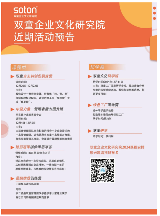 近期,“雙童”又將迎來(lái)阿里國際站研學(xué)活動(dòng),來(lái)自全國各地的商家將從“雙童”這一行業(yè)標桿中汲取寶貴的成功經(jīng)驗和創(chuàng )新理念,并深度學(xué)習“雙童”這家中小企業(yè)如何在數字化浪潮中乘風(fēng)破浪,通過(guò)持續的技術(shù)革新與思維轉換,實(shí)現“輕松管理、無(wú)為而治、解放自己”!