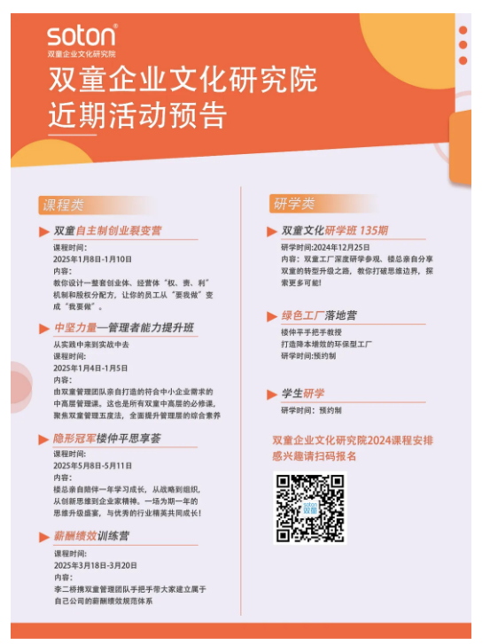 如果你也對“雙童”充滿(mǎn)好奇,也想賦能團隊共同成長(cháng),歡迎走進(jìn)12月25日【雙童文化研學(xué)班】,與上百位優(yōu)秀的創(chuàng )業(yè)者一起學(xué)習!少量名額,歡迎咨詢(xún)鎖定!