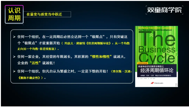 在中小企業(yè)平均壽命不到三年的情況下,企業(yè)正面臨著(zhù)越來(lái)越難的經(jīng)濟周期,如何讓企業(yè)持續保持足夠的“活性”和“活力”, 需要創(chuàng )業(yè)者擁有強烈的經(jīng)營(yíng)“周期意識”,只有認識周期,才能防范周期,進(jìn)而帶領(lǐng)企業(yè)穿越周期!