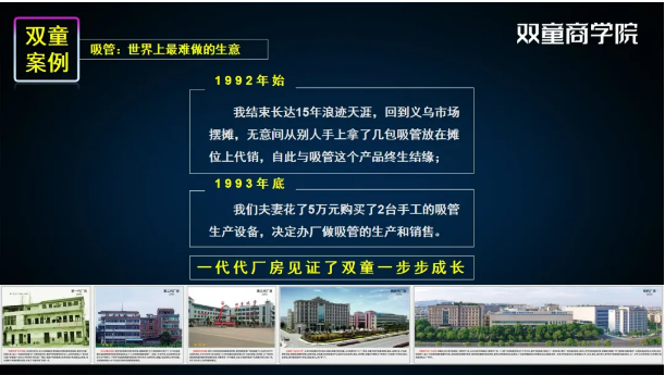 此后六年,雙童創(chuàng )業(yè)平臺成功孵化出了16家創(chuàng )業(yè)體和26個(gè)經(jīng)營(yíng)體,并創(chuàng )造了3.6倍的業(yè)績(jì)增長(cháng)!形成了以吸管制造業(yè)為基礎,以國際貿易和創(chuàng )業(yè)教育兩大板塊為融合的新型產(chǎn)業(yè)模式,完成了從“一根吸管”到“創(chuàng )業(yè)平臺”的轉變!