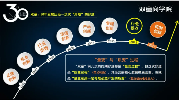 雙童創(chuàng )始人樓仲平時(shí)刻保持著(zhù)自我進(jìn)化,充滿(mǎn)“成長(cháng)活性”,所以雙童企業(yè)能夠在30年間充滿(mǎn)活力活性,不斷穿越一個(gè)個(gè)經(jīng)營(yíng)周期: