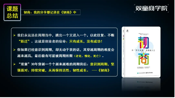 所以,樓老師正是想要通過(guò)自己和雙童的案例,影響在座的企業(yè)家及同學(xué)們,一定要重視“周期意識”,因為只有認識周期,才能防范周期,進(jìn)而帶領(lǐng)企業(yè)穿越周期!讓自己的企業(yè)不是“茍且偷生”,而是有尊嚴,有活性,有活力,“基業(yè)長(cháng)青”的活著(zhù)!