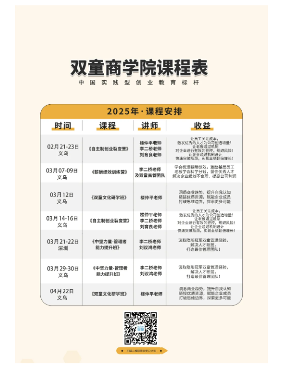 為了能夠助力更多中小企業(yè)也能運用這套機制實(shí)現激勵員工、留住優(yōu)秀人才和業(yè)績(jì)倍增,雙童商學(xué)院早在2022年,雙童商學(xué)院就針對該機制打磨成《自主制創(chuàng )業(yè)裂變營(yíng)》課程,并不斷地升級迭代,該課程已經(jīng)是一套非常成熟的、可復制、可實(shí)踐的課程,完全契合中小微創(chuàng )業(yè)者的需求。