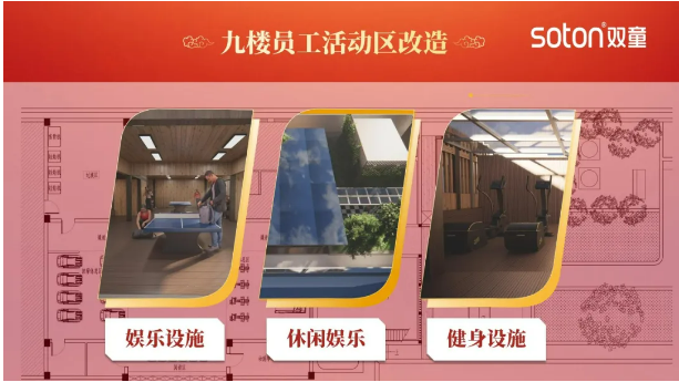 在分享的尾聲,李總向大家介紹了雙童的新項目。為了讓這個(gè)工廠(chǎng)變得更加“有趣”,更受年輕人喜歡,老廠(chǎng)9樓將增設娛樂(lè )設施、健身設施以及抓娃娃機等設備,確保每位員工都能享受到這份樂(lè )趣。