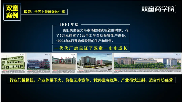 此后六年,雙童不僅搭建了創(chuàng )業(yè)平臺,還成功孵化出了16家創(chuàng )業(yè)體和26個(gè)經(jīng)營(yíng)體,并創(chuàng )造了4倍的業(yè)績(jì)增長(cháng)!形成了以吸管制造業(yè)為基礎,以國際貿易和創(chuàng )業(yè)教育兩大板塊為融合的新型產(chǎn)業(yè)模式!