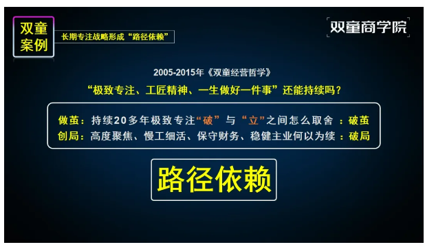 對“一根吸管”長(cháng)期極致的專(zhuān)注,讓雙童成為吸管行業(yè)的“隱形冠軍”,但同時(shí)也形成了雙童的“路徑依賴(lài)”。2015年,雙童遇到了行業(yè)的“天花板”,因為傳統制造業(yè)的創(chuàng )新紅利已經(jīng)開(kāi)始衰竭,國際禁塑也讓吸管的應用場(chǎng)景在大幅減小,行業(yè)變得越來(lái)越內卷,《雙童經(jīng)營(yíng)哲學(xué)》(2015版)中倡導的“極致專(zhuān)注、工匠精神、一生做好一件事”不可持續!