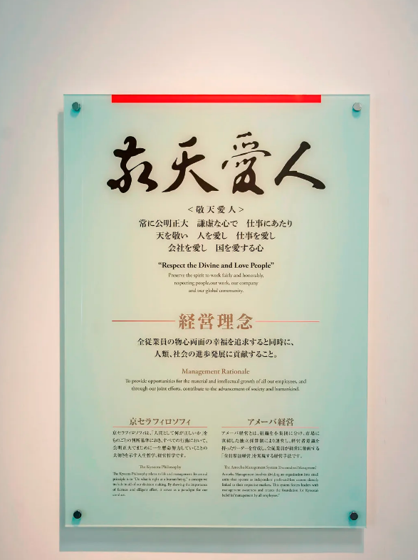 參觀(guān)京瓷,其實(shí)最重要的不是觀(guān)看琳瑯滿(mǎn)目的產(chǎn)品并為之驚嘆,而是感受、學(xué)習京瓷的文化,因為文化才是京瓷的靈魂。在整個(gè)展館內,同學(xué)們隨處可以感受到稻盛和夫先生“敬天愛(ài)人”的經(jīng)營(yíng)理念,“6個(gè)精進(jìn)”和“經(jīng)營(yíng)十二條”都被放在了最顯眼的位置。