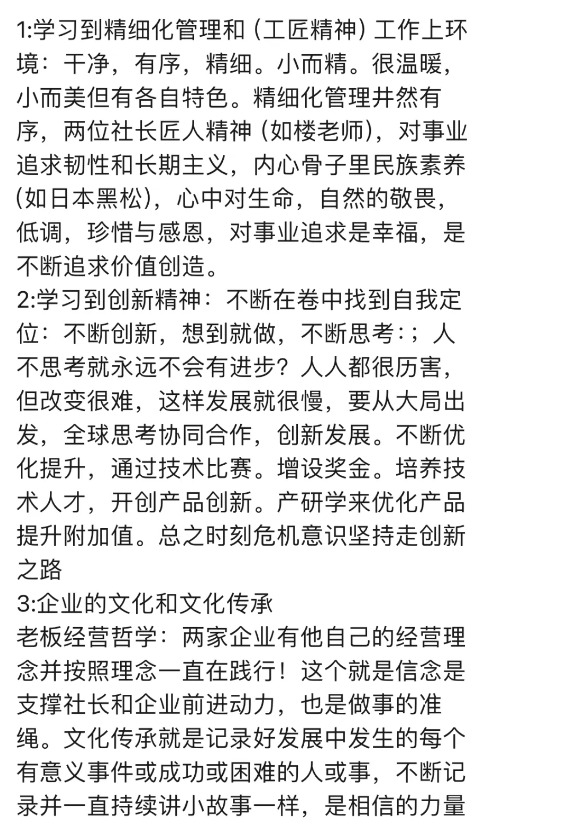 無(wú)論是京瓷集團對文化的重視、稻盛先生“敬天愛(ài)人”的思想,還是京都紋付株式會(huì )社以傳承與創(chuàng )新并重的經(jīng)營(yíng)理念,都給同學(xué)們帶來(lái)了不同程度的啟發(fā),也讓大家對往期“弟子班”的課程內容有了新的理解。因此,在企業(yè)研學(xué)之旅結束后,學(xué)員們紛紛用文字記錄下了自己的感悟和體會(huì ):