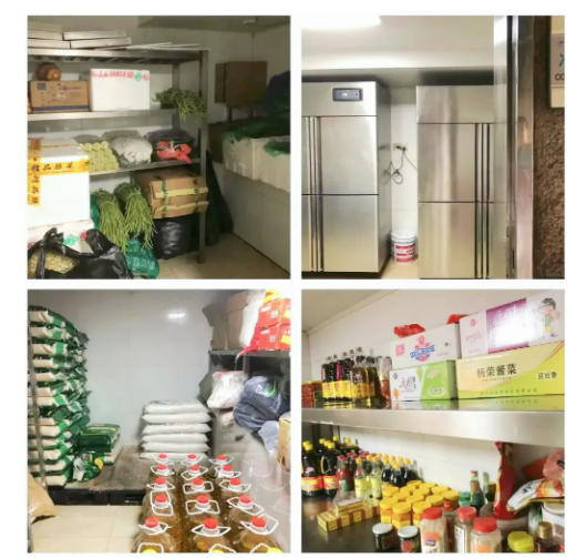 其中采購入庫的魚(yú)、肉等易腐爛變質(zhì)的葷菜必須分區妥善保存在冰箱中,新鮮蔬菜與米、面等主食原料分開(kāi)存放;除了常規的食材分開(kāi)存放外,食用油、大米、面粉、面條、調味料等食材消耗品,進(jìn)行分類(lèi)、分架、隔墻、離地存放。