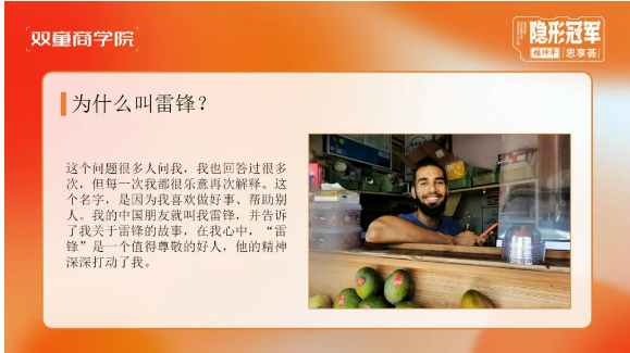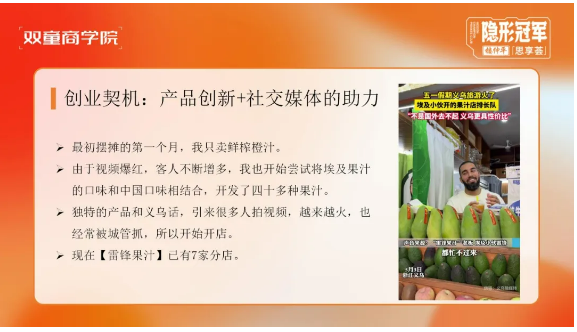 他長(cháng)著(zhù)一張異域風(fēng)情的臉,嘴里卻能說(shuō)著(zhù)正宗的義烏話(huà),在課上分享自己從擺地攤到網(wǎng)紅老板的創(chuàng )業(yè)歷程,帶領(lǐng)大家走進(jìn)真正的“認知升級”與“跨界突圍”,從全新的視角,重新定義“創(chuàng )業(yè)者成長(cháng)”的內涵與路徑!