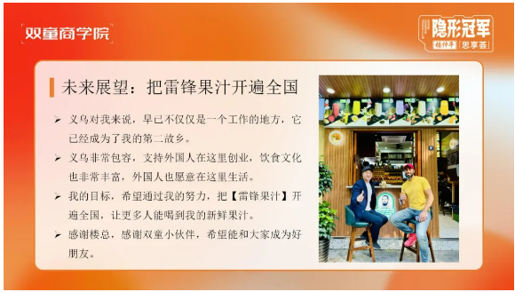 在此期間,一段他與阿姨以流利的義烏方言親切交談的視頻在網(wǎng)絡(luò )上迅速傳播,這段視頻意外地成為了他向飲品市場(chǎng)轉型的契機與起點(diǎn),也給了他繼續前進(jìn)的動(dòng)力。隨著(zhù)視頻的廣泛傳播,他的顧客數量不斷增多,雷鋒也開(kāi)始嘗試將埃及果汁的口味和中國口味相結合,成功研發(fā)出四十多種果汁產(chǎn)品。