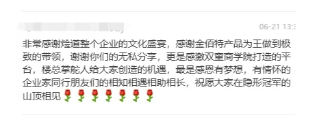 在專(zhuān)題分享環(huán)節,燴道運營(yíng)總經(jīng)理吳春云先是介紹了與雙童的結緣之路。2024年在山東淄博的一次活動(dòng)上,吳總首次聽(tīng)到樓仲平老師的分享,被他的經(jīng)營(yíng)理念所深深吸引,先后帶領(lǐng)公司小伙伴超30人次走進(jìn)雙童研學(xué)以及深度學(xué)習自主創(chuàng )業(yè)裂變機制。