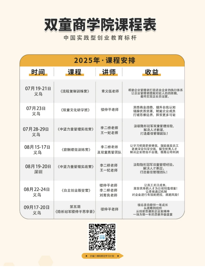 如果你也對“雙童”充滿(mǎn)好奇,也想全面了解“雙童”的企業(yè)文化、經(jīng)營(yíng)理念、精細化管理,通過(guò)系統的課程深入地探索、學(xué)習“雙童”成為行業(yè)“隱形冠軍”的底層邏輯,從而賦能自己的企業(yè),歡迎咨詢(xún)報名“雙童”課程!
