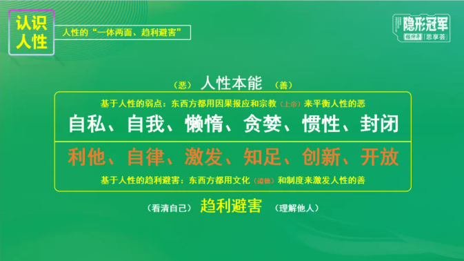 但人性的真相是:所有的人性假設都不抵“人性本能”。所以要理解人性本能背后的貪婪、欲望、動(dòng)機和行為失控而導致的緣起。理解一切看似非理性行為決策的背后的人性劣根性。