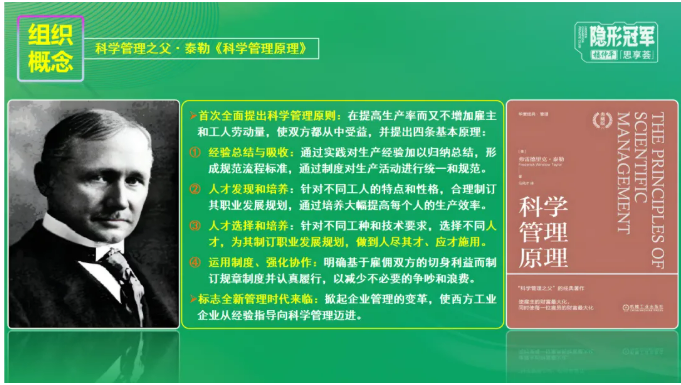 科學(xué)管理之父泰勒《科學(xué)管理原理》一書(shū)中,首次全面提出科學(xué)管理原則在提高生產(chǎn)率而又不增加雇主和工人勞動(dòng)量,使雙方都從中受益。這標志全新管理時(shí)代的來(lái)臨。