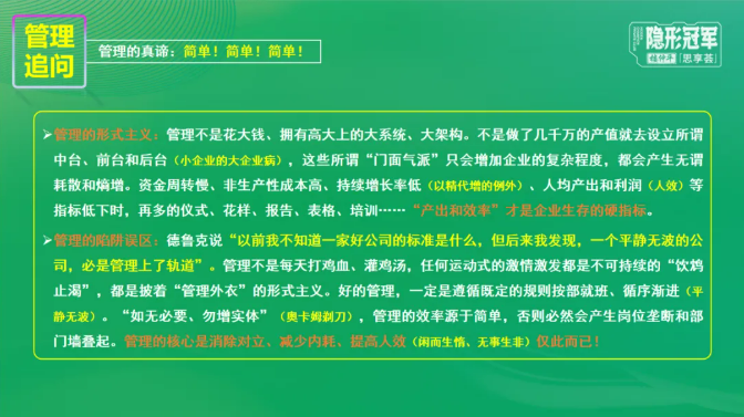 而管理的真諦則是“簡(jiǎn)單”,一定要避免追求形式主義。樓老師用一家家具企業(yè)的典型案例來(lái)警示同學(xué)們:管理的效率源于簡(jiǎn)單,否則容易產(chǎn)生崗位壟斷和部門(mén)墻,小企業(yè)也會(huì )染上大企業(yè)病。