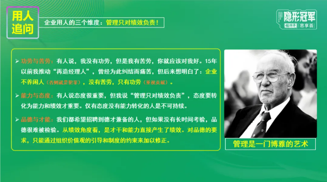 企業(yè)用人通常會(huì )從三個(gè)維度考量:功勞與苦勞、能力與態(tài)度、品德與才能。但樓老師還是提醒大家,管理只對績(jì)效負責!
