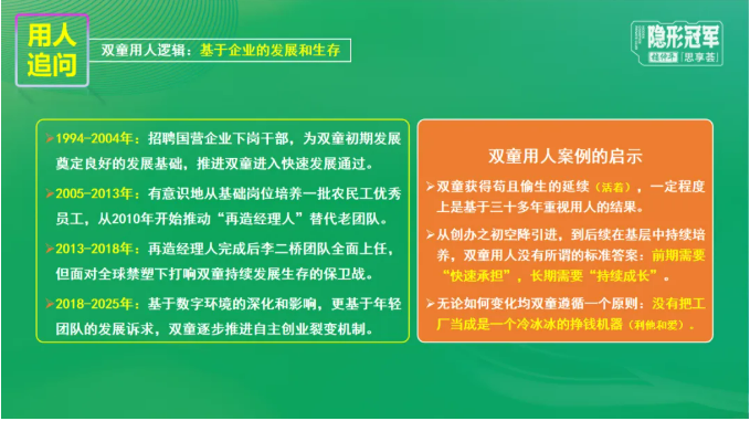 雙童的用人方式是從外部引進(jìn)逐漸過(guò)渡到內部培養,其邏輯是基于企業(yè)的發(fā)展和生存而變化的。前期是需要“快速承擔”的,長(cháng)期則更看重“持續成長(cháng)”。