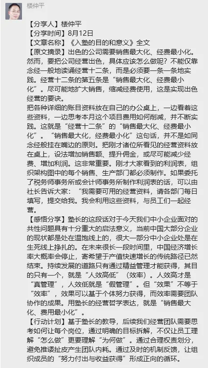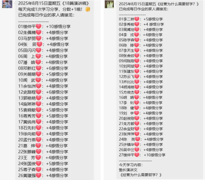 雙童塾生們也積極響應樓總的號召,每天晚上學(xué)習群里熱鬧非凡。每個(gè)人在自己學(xué)習后,還能通過(guò)其他同修的分享來(lái)拓寬視角。許多人表示在碎片化的時(shí)間里難得有機會(huì )可以拿起書(shū)本學(xué)習,很高興能總結過(guò)往、共同規劃,一起成長(cháng)。
