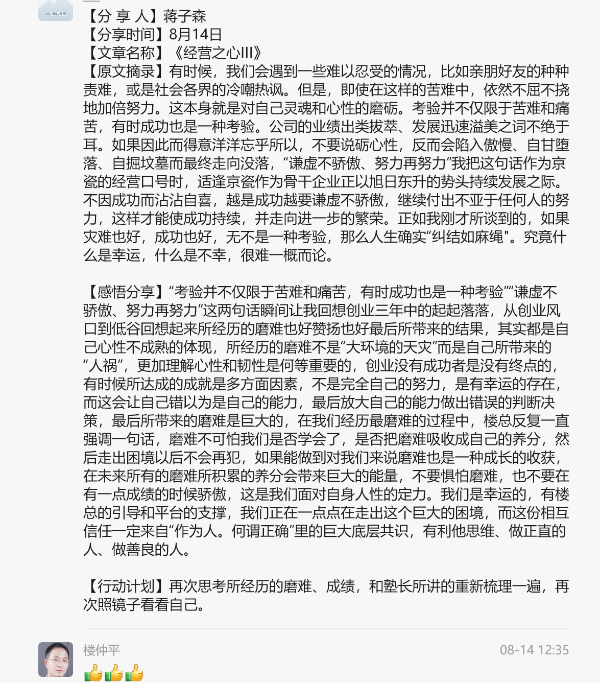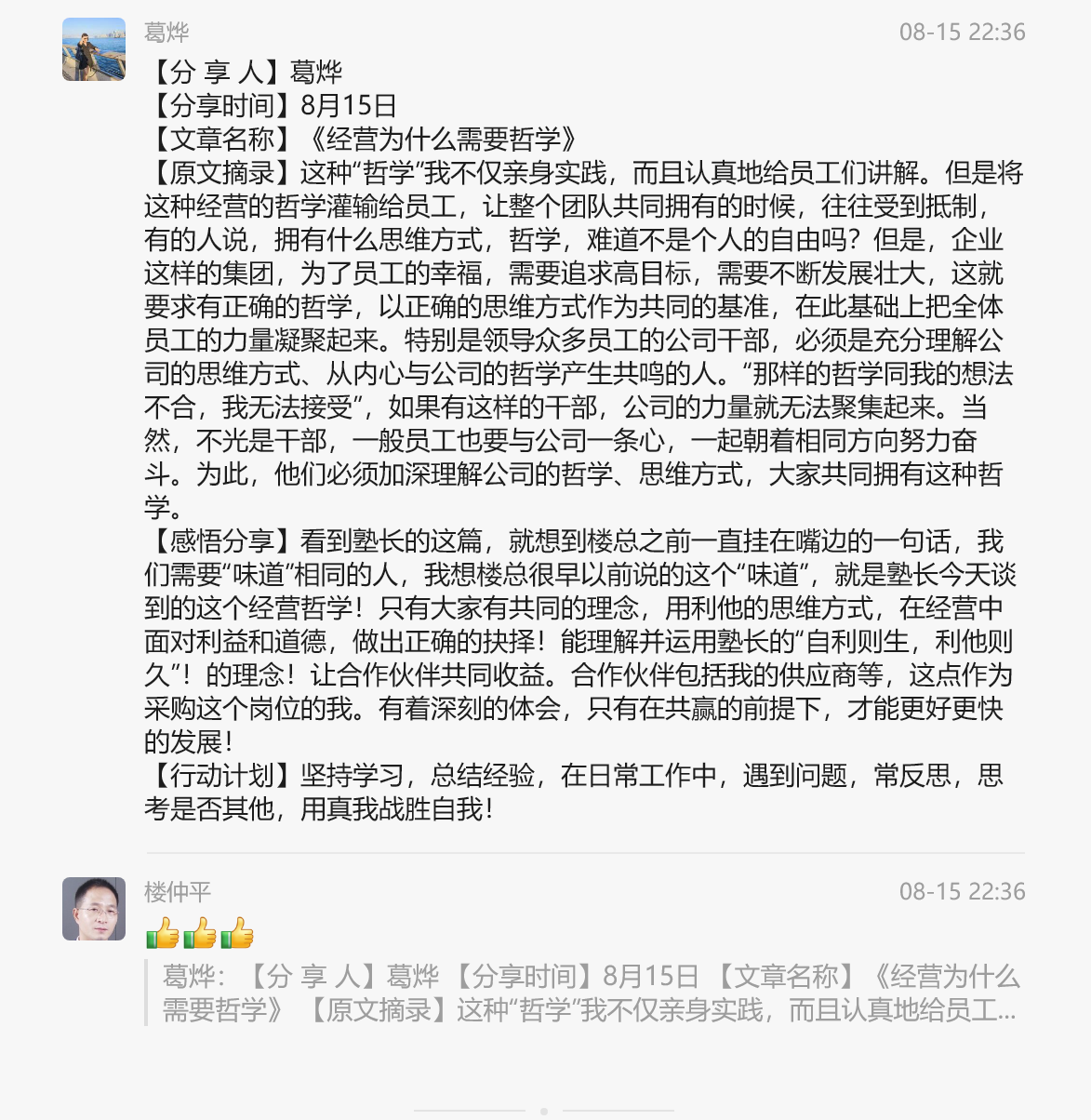 “稻盛哲學(xué)首先是我們的精神食糧,讀道生的疏會(huì )接受到巨大的能量和勇氣。高深哲學(xué)是我們邁向人生幸福的必需品、營(yíng)養品,可以滋潤我們的心,促使我們提高心性,應當成為我們的工具,每天都使用。我不僅自己要、自己讀,現在還召喚我們全體進(jìn)出口員工一起看,一起交流,讓大家同頻共振,共同進(jìn)步!”
