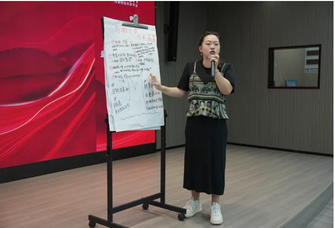 在悠揚輕松的音樂(lè )中,小組互動(dòng)環(huán)節開(kāi)啟。十分鐘內大家用白紙板寫(xiě)下學(xué)習感悟,提煉總結,并由每個(gè)小組派代表總結發(fā)言。雖說(shuō)這只是第一周的學(xué)習總結,但在短短幾天時(shí)間里,大家都收獲滿(mǎn)滿(mǎn),又在交流互動(dòng)中不知不覺(jué)復盤(pán)了一遍,加深了理解。