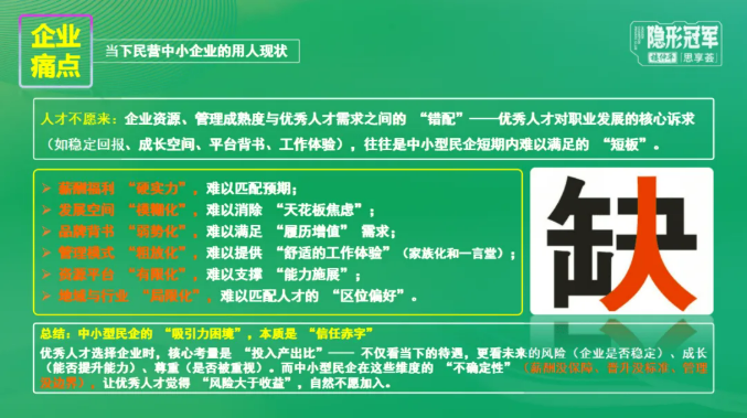 李老師首先拋出一個(gè)根本性問(wèn)題:什么是人才?他指出,真正的人才,是能夠持續創(chuàng )造價(jià)值的人。他進(jìn)一步分析了當前民營(yíng)中小企業(yè)面臨的核心用人困境:人才難以吸引、來(lái)了難以發(fā)揮作用。