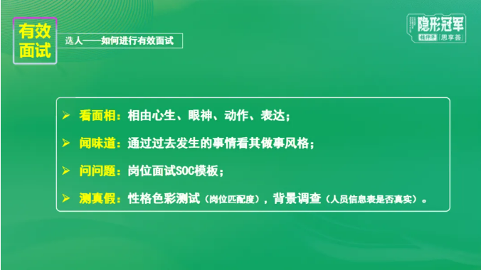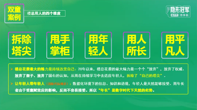 解決了選人問(wèn)題,那如何讓人才發(fā)揮該有的作用呢?李二橋老師隨即分享了雙童的用人理念,為學(xué)員提供了具有實(shí)踐意義的參考。雙童的核心用人原則是“以德為先,適我用者為才”,強調內部培養為主、外部引進(jìn)為輔,既重視經(jīng)驗積累,更看重實(shí)際能力與成果輸出。
