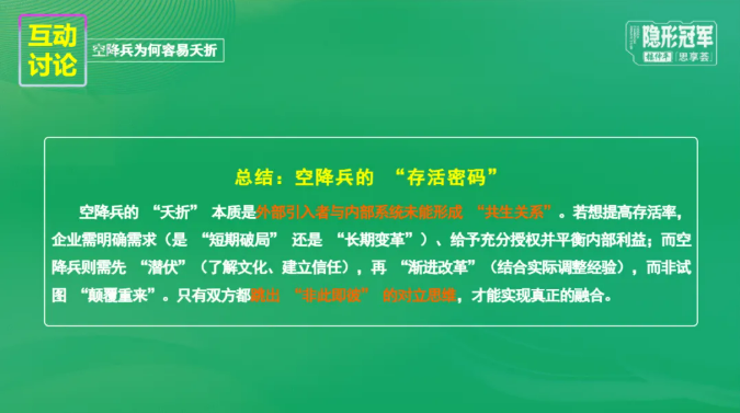 他還分析了“內部選拔”與“外部招聘”的優(yōu)劣勢及適用場(chǎng)景,強調企業(yè)應基于發(fā)展階段靈活選用策略。針對“空降兵”這一典型現象,李老師指出成功的關(guān)鍵在于立“共生關(guān)系”:前三個(gè)月應多觀(guān)察、少主導,以技術(shù)專(zhuān)長(cháng)協(xié)助其他部門(mén),逐步建立信任、推動(dòng)變革,最終實(shí)現團隊融合。