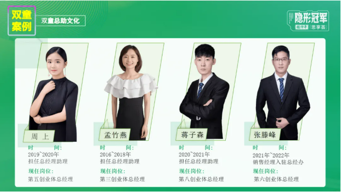 此外,雙童推行的“助理文化”也為人才內部成長(cháng)提供了清晰路徑。例如,第五創(chuàng )業(yè)體負責人周上、第三創(chuàng )業(yè)體負責人孟竹燕、第八創(chuàng )業(yè)體負責人蔣子森等人,均是從助理崗位起步,通過(guò)系統培養和實(shí)戰歷練逐步晉升至部門(mén)負責人,這也充分體現了雙童在人才梯隊建設與機制賦能上的顯著(zhù)成效。