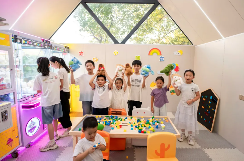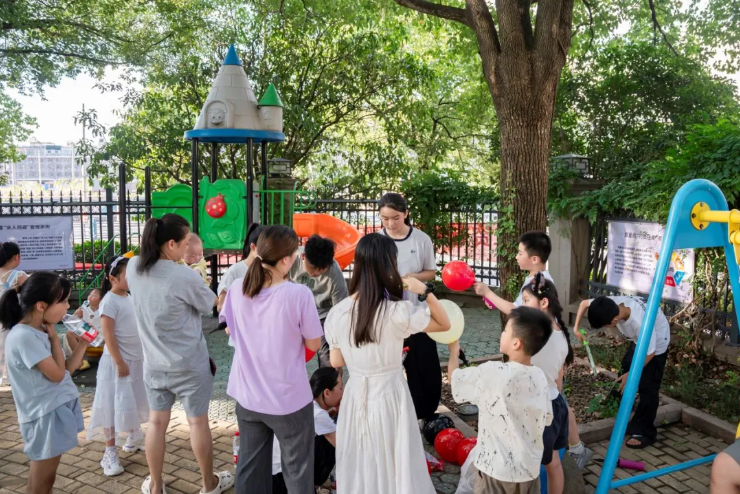 活動(dòng)現場(chǎng)充分利用了雙童的場(chǎng)地優(yōu)勢:雙童一號樹(shù)的濃密樹(shù)蔭下,布置了兩個(gè)大充氣泳池和其他游戲設施;新建成的森林長(cháng)廊中,抓娃娃機、積木、課外書(shū)一應俱全,儼然一個(gè)童趣小天地。小朋友們迅速沉浸在這場(chǎng)夏日盛宴中:泳池里水花四濺、笑語(yǔ)不斷,長(cháng)廊間專(zhuān)注抓娃娃、拼積木的身影隨處可見(jiàn),一號樹(shù)下,各種趣味游戲也正熱烈進(jìn)行。