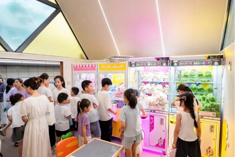 運送氣球游戲結束后,下一站便是森林長(cháng)廊小屋!里面不僅僅有娃娃機,還放置了大量課外書(shū)以及小黑板、積木等,方便小朋友們玩耍!小朋友們用氣球游戲中獲得的游戲幣開(kāi)始了抓娃娃之旅,當看到娃娃機里琳瑯滿(mǎn)目的可愛(ài)玩偶時(shí),他們紛紛“哇”出聲來(lái),興奮極了。