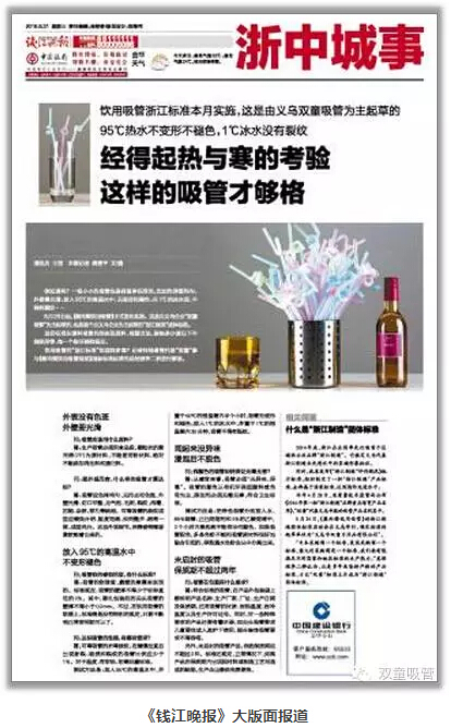 826日,由“雙童”主導起草的“浙江制造”團體標準《聚丙烯飲用吸管》正式發(fā)布實(shí)施!這份標準從塑料吸管的形態(tài)到原料、檢測方法、耐熱多少度以下不能變形等,每一個(gè)細節都有明確的規定。消息一出,引起了新聞媒體的高度關(guān)注。這不,浙江的權威媒體《錢(qián)江晚報》對此也進(jìn)行了大版面報道,下面妞就帶大家來(lái)看看吧!