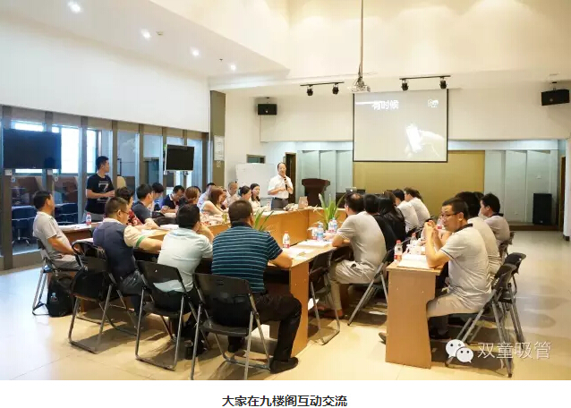 參觀(guān)后,大家再次來(lái)到九樓閣,與當家人樓總進(jìn)行深入交流,互動(dòng)提問(wèn)。首先,當家人樓總向大家闡述了他經(jīng)營(yíng)”雙童“二十多年所積累下來(lái)的寶貴經(jīng)驗心得,向大家講述了”雙童“由初心、恒心、平常心組成的”匠人之心“。