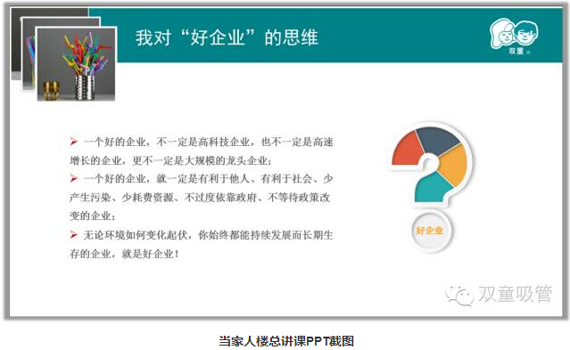 當家人樓總答:大家總認為大的發(fā)展快的企業(yè)才是好企業(yè)。其實(shí)企業(yè)要活著(zhù),持續的產(chǎn)出產(chǎn)品,并且產(chǎn)品越做越好才是一個(gè)好企業(yè),好的企業(yè)是不斷滿(mǎn)足消費者需求的企業(yè)!
