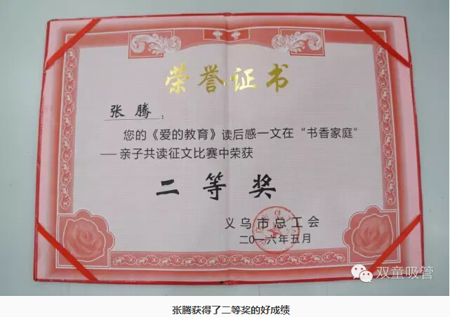 今年上半年,義烏總工會(huì )組織了一次“書(shū)香家庭”——親子共讀活動(dòng)。聽(tīng)說(shuō)有這樣的活動(dòng),“雙童”的寶貝們也想去試試。這不,我們生產(chǎn)廠(chǎng)長(cháng)李秀前和后勤主管張秀真的兒子張騰在和媽媽一起親子閱讀了《愛(ài)的教育》之后,寫(xiě)了一篇讀后感,參加了此次比賽。沒(méi)過(guò)多久,義烏總工會(huì )就傳來(lái)消息,這篇讀后感在征文比賽中獲得了義烏地區二等獎的好成績(jì)!張騰小朋友不僅有大大的紅包獎勵,還有獲獎證書(shū)哦!