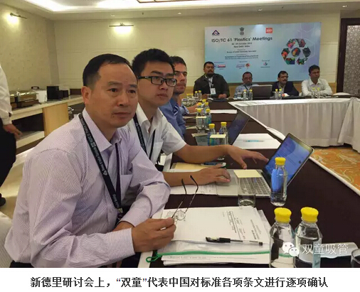 2015年10月6日,ISO TC61國際標準化組織年會(huì )在印度新德里召開(kāi),作為最后一次國際標準起草工作的定稿工作,“雙童”代表中國派出了強大的六人技術(shù)代表團。經(jīng)過(guò)幾天緊張的討論,“雙童”會(huì )同各參與主席國對《聚丙烯飲用吸管規范》送審稿的各項條文進(jìn)行最終的程序性確認,在參與各國代表一致同意下形成了《聚丙烯飲用吸管規范》ISO國際標準報批稿,提交給瑞士日內瓦的ISO國際標準化組織最終審定。