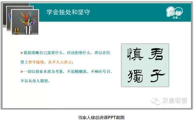 由此可見(jiàn),盲目地交朋友,拉關(guān)系只會(huì )導致自己越來(lái)越累,最后還是不能把事情做好。當家人樓總曾經(jīng)在他的課件里這樣說(shuō),我很清晰自己需要什么,應該拒絕什么,所以在經(jīng)營(yíng)上堅守底線(xiàn),從不人云亦云,不追隨潮流,不響應號召、不盲從旁人期望。