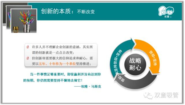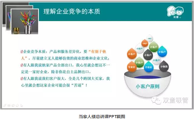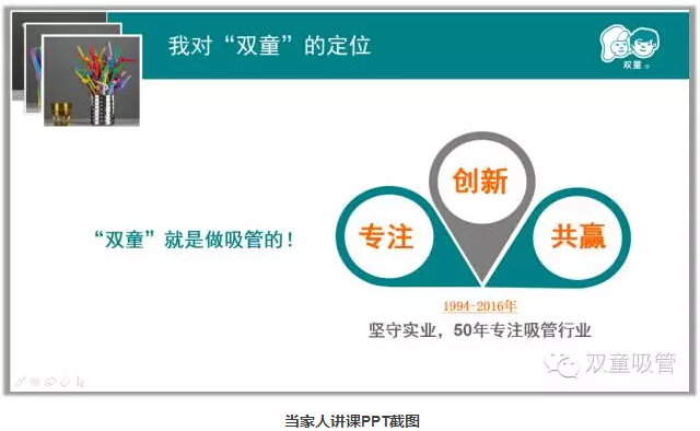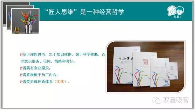 首先,當家人樓總分享了自己30多年的創(chuàng )業(yè)經(jīng)歷,在不斷失敗的教訓中,他選擇了把一根吸管做精、做細!通過(guò)二十多年積累,“雙童”初步形成了專(zhuān)注經(jīng)營(yíng)、創(chuàng )新進(jìn)取、綠色低碳、和諧共贏(yíng)和精細化管理的發(fā)展理念,“雙童”也發(fā)展的越來(lái)越好!而這些都離不開(kāi)“匠心”。