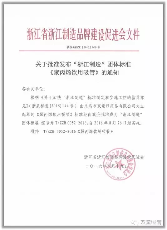 據了解,截至目前,已提前完成全年100個(gè)“浙江制造”標準的制定任務(wù),預計到年底前將制定“浙江制造”標準120個(gè)。而早在今年的8月26日,“雙童”就收到了浙江省浙江制造品牌建設促進(jìn)會(huì )發(fā)出的通知,正式通知由“雙童”為主起草的“浙江制造”團體標準《聚丙烯飲用吸管》正式發(fā)布實(shí)施!