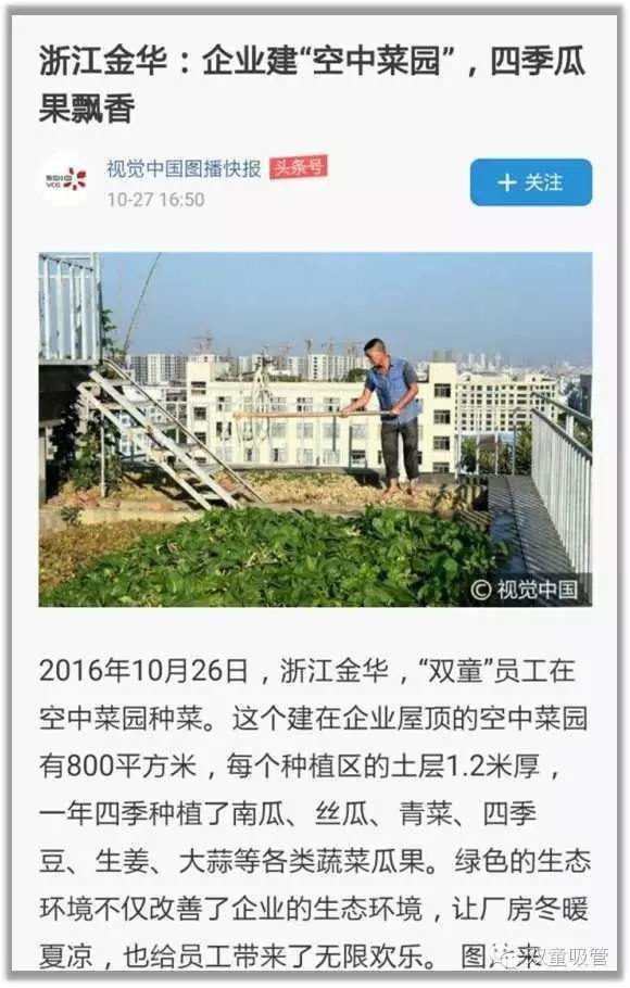 “雙童的屋頂菜園、節能降耗措施等生態(tài)建設引起了不少政府和媒體的關(guān)注!這不,10月底,義烏宣傳部的攝影記者也來(lái)到雙童,實(shí)地參觀(guān)雙童的屋頂菜園,回去后寫(xiě)了一篇圖文報道,此篇報道被發(fā)布在《今日頭條》、《視覺(jué)中國》等多家媒體上,引發(fā)了大量轉發(fā)和關(guān)注!少說(shuō)話(huà),多放圖,讓大家一飽眼福?。?!