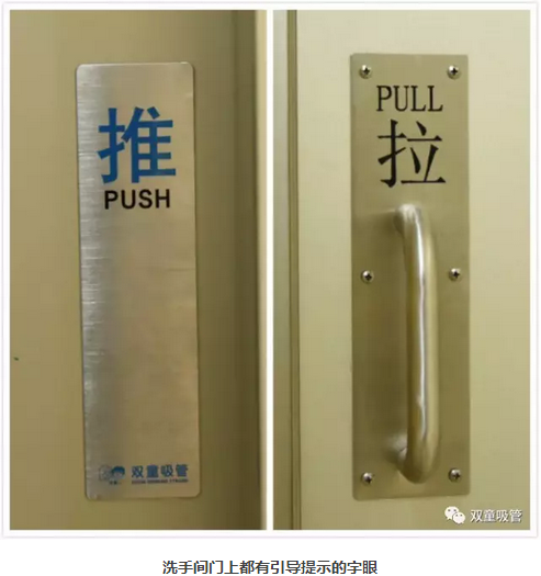 進(jìn)入衛生間時(shí),門(mén)上有“推”、“拉”等提示,墻上的相框也十分精致!