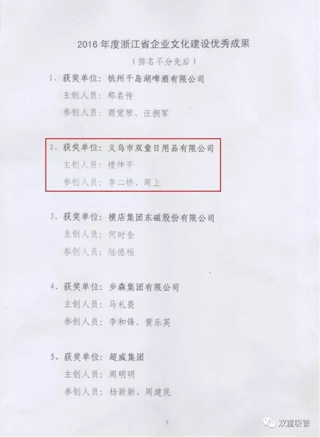 今年上半年,浙江省企業(yè)聯(lián)合會(huì )進(jìn)行了2016年度浙江省企業(yè)文化建設優(yōu)秀成果的評選活動(dòng)。這不,最近傳來(lái)了好消息,這次一共有五家企業(yè)獲得此項殊榮,“雙童”作為義烏唯一一家獲獎企業(yè)也名列其中呢!大家是不是很好奇“雙童”是如何建設企業(yè)文化的呢?下面吸管妞就帶大家來(lái)一看究竟吧!