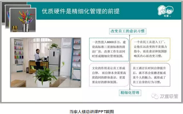 優(yōu)質(zhì)硬件是精細化管理的前提,更是提升產(chǎn)品品質(zhì)的前提,它不僅能潛移默化地影響員工的素養,更能提高員工的質(zhì)量意識!所以好的環(huán)境決定了員工會(huì )做出怎樣的產(chǎn)品!唯有一流的硬件環(huán)境,才能生產(chǎn)出世界一流的完美產(chǎn)品!看到這里,大家應該明白“雙童”為何能做好一根小吸管了吧!