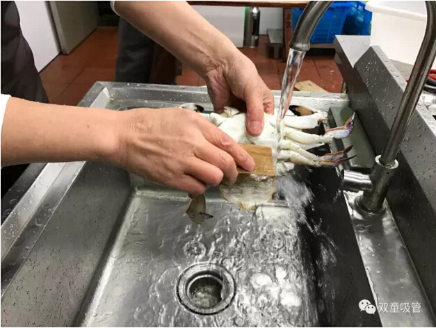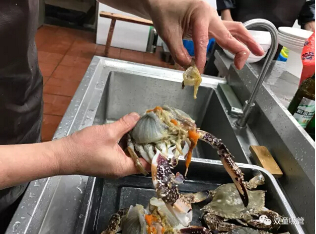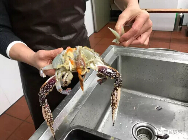 十二、取出砂囊后將蟹身兩側的蟹鰓(看上去像魚(yú)鰓)用手工拔除干凈,如果蟹鰓底部有烏黑砂子,千萬(wàn)不要用清水沖洗,用干凈牙刷局部清洗一下就可以了。