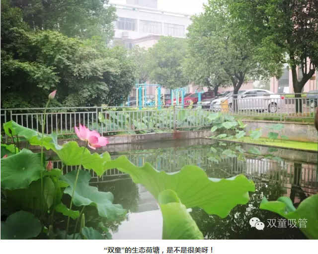 在大草坪旁是“雙童”人最喜歡駐足停留的生態(tài)荷塘。它不僅美化環(huán)境,而且還是我們的中水儲存池,起到了節能降耗的作用!